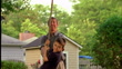 A father pushes his young son on a tire swing in their suburban backyard. - HD stock video