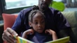 Father and daughter read book together in home.
