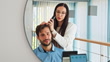 Close-up shot of a female specialist using a diagnostic device to scan a male client's scalp at a head spa. The specialist attentively examines the hair and scalp condition while the client remains relaxed in a contemporary spa setting.