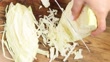 Female hands chopping white cabbage with knife on cutting board at kitchen. Healthy food, dieting - HD stock video