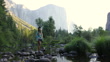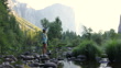 4k video footage of woman in cap hiking at picturesque valley contemplating majestic landscape with dramatic mountain range, reflection river and green forest during bright sunrise over Yosemite National park, California, the United States