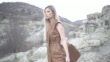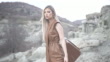 Female With Brown Bodysuit Carries A Suitcase With Same Color While Standing On Rocky Terrain - 4K stock video