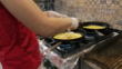 Mid adult woman frying eggs in frying pan to make scrambled eggs for breakfast in commercial kitchen