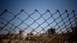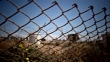 traveling shot along rusty tangled fence and barbed wire, some out o focus structures in background, shot ends on a locked gate good for depiction of jail, camp, detention center, prison, freedom, escape, desperation etc'