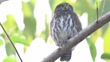 A ferruginous pygmy owl (Glaucidium brasilianum) perched on a tree and turns its head in all directions. The characteristic black spots on the back of the head look like a second pair of eyes. - 4K stock video