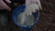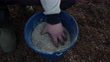 NPK Fertilizer. Nitrogen, phosphorus and potassium. Blue bucket on mulched garden soil. Hand showing fertiliser.