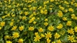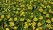 Field full of small yellow spring flowers on sunny day in wind. Winter aconite