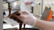 Filling molding cast with pouring milk chocolate and scrapping off extra filling with spatula