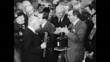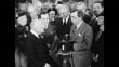 Film producer Carl Laemmle celebrates 30 years in the movie business / Rupert Hughes presents Laemmle with a testimonial scroll / Laemmle thanks Hughes and the crowd claps / overview of the party comprised of famous people sitting around small circular tables / voiceover points out certain people as camera focuses on them including, Edward Arnold, Otto Kruger, Marguerite Churchill, Hobart Bosworth, Cecil B DeMille, Jesse Lasky, May Robson, King Baggot, Binnie Barnes, and Charlie Murray. Carl Laemmle celebrates 30 years in movies on February 23, 1936 in Universal City, California (Footage by Getty Images)
