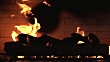 Fireplace with crackling fire. Flame is putting off mysterious glow as the rest of the frame is silhouetted by the fire.
