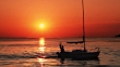 Fishing boat moves through the water in front of mesmerizing sunset.