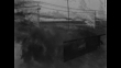 Flash and explosion of nuclear bomb far away in desert / fisheye view, camera jostled / VS one story building hit by winds from both sides; two story house and telephone poles and wires disintegrated / Note: exact month/day not known