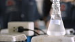spin solution in flask on engineer laboratory by two people are working is behind.