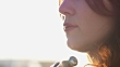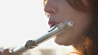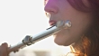 Beautiful young flautist woman playing the flute outdoors. Close-up of a flautist mouth and flute. Sunny, summer day
