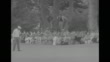 Title: "Fleck New Golf Champion - Beats Hogan in U.S. Open" superimposed over wide shot of golf course / WS crowd / WS golfer Ben Hogan getting ready to tee off / MS Hogan teeing off / VS people looking through sportscopes / MS Jack Fleck, who becomes National Open Golf Champion in this tournament, teeing off / WS players and crowd walking off / VS Hogan on 6th green; he hits ball and camera follow the ball in flight - ball lands and rolls / Fleck on 6th green, he hits ball and ball drops in cup for 20 foot putt / VS Hogan on 6th, camera tilts down to him getting ready to putt / Back view of crowd / VS Hogan putting; ball goes past cup / VS Hogan sinks putt; Hogan picks up ball; camera follows grinning Hogan past camera / VS 10th green – Fleck hits ball, makes motion with leg; ball drops into hole / WS players and gallery approaching 18th / rear shot Hogan on 18th getting ready to putt; he hits ball, it goes into hole, and Hogan looks at hole / MS Fleck approaching ball on 18th; he hits ball and it goes into hole / Fleck picks up ball; camera pans to crowd as Hogan comes walking forward to Fleck / Hogan and Fleck shaking hands / MS Fleck and Hogan walking toward presentation tables / WS crowd applauding / MS Hogan seated; all stand up and applaud him / Angle view Hogan seated – applause / VS Fleck holding trophy, Hogan alongside / CU Fleck with trophy