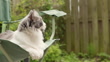 Fluffy cat relaxing on green camping chair in backyard - 4K stock video