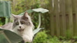 Gray and white cat resting on a green camping chair in a backyard