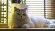 Fluffy white and grey cat with long hair lying comfortably on a surface, enjoying the warm ambient light filtering through window blinds, creating a cozy and peaceful atmosphere indoors