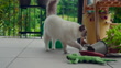 Fluffy White Cat Playing with Toy on Balcony - 4K stock video