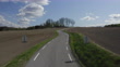 Drone filming road across field in early springtime through open landscape