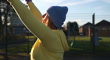 A close-up, slow-motion shot of a mature woman enjoying an outdoor netball session on a sports court during a cold, sunny day. The woman is holding a red netball and taking a deep breath before aiming and throwing the ball. She is dressed in warm sports clothing on a sunny winter's day in Northumberland, North East England.