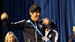 Footballer Shinji Okazaki joins teammates onstage in front of a large crowd as Leicester City F.C. celebrates its Premier League win in 2016.