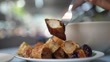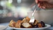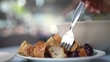 Fork lifting a deep-fried eggplant from a plate of Chinese Yong Tau Foo served with assorted side items. - 4K stock video