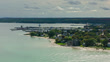 Aerial establishing shot of Mackinaw City taken by a drone flying towards the Mackinac Island Ferry on a cloudy day.