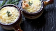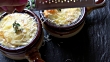 Grating Parmesan Cheese onto bowls of delicious french onion soup.