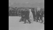 French President Albert Lebrun and others, including a woman in a flowing white garment (probably a Red Cross worker), approach the monument and are cheered by onlookers as trumpets and snare drums are played / SOT Lebrun [in French] speaks in front of three tall microphones / Pan down of the huge tower of the ossuary; "PAX" carved under an archway; the robed woman stands with men holding flags / Numerous bemedaled World War I veterans; marchers with French infantry flag passing / Marshal Philippe Petain at left with Lebrun; soldiers with bayoneted rifles briskly marching past
