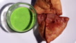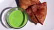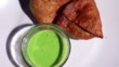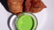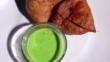 Crispy fresh deep fried samosa table top view spinning isolated on white background.