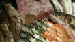 Fresh seafood counter displaying variety of raw fish species including red mullet, sea bream, grouper, and turbot arranged on ice bed. Skewers with shrimp and vegetables sit alongside large whole fish decorated with lemon and lettuce.
