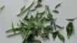 Fresh Thai Kale, Thai Basil Leaf, Green Pea, Beans and Chili Pepper Dropped on Kitchen Worktop. Flat lay top-down composition on white background. Slow Motion.