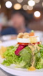 Close-up of a fresh vegetable salad with lettuce, tomato, croutons, and dressing served at a restaurant table. Healthy food concept with pleasant soft bokeh background.
