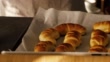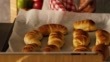 Close-up shot of a bowl with flour on a kitchen counter. A woman is removing the casserole from the oven and puts it on the counter.