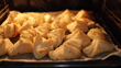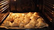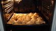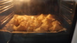 4K resolution footage of a golden puff pastries baking on parchment paper in an oven, captured in warm ambient lighting