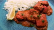 The vibrant orange Indian cuisine dish of chicken tikka masala, served with freshly steamed white basmati rice in a vivid blue glazed ceramic dish. Freshly chopped cilantro has been sprinkled on top as a garnish. The scene slowly rotates, shot from directly above.