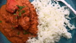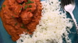 Freshly cooked chicken tikka masala is served with fresh basmati rice in a blue rustic ceramic dish. - 4K stock video