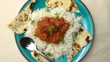 Freshly cooked chicken tikka masala is served with fresh Indian white basmati rice and naan bread on a blue textured ceramic dish. - 4K stock video