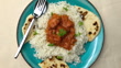Freshly cooked chicken tikka masala is served with fresh Indian white basmati rice and naan bread on a blue textured ceramic dish. - 4K stock video