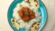 Freshly cooked chicken tikka masala is served with fresh Indian white basmati rice and naan bread on a blue textured ceramic dish. - 4K stock video