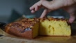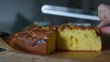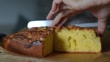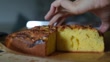 Close-up of a freshly baked homemade banana butter cake after being sliced, showing its golden moist crumb and soft texture, highlights the comforting warmth and aroma of home baking.