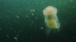 Fried Egg Jellyfish also known Egg-Yolk Jellyfish (Phacellophora camtschatica) amongst an algal bloom. Near Victoria on Vancouver Island. British Columbia, Canada. Filmed in slow motion with Red camera.