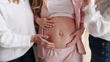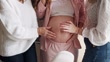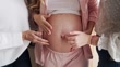 Three women gather to celebrate an upcoming arrival, placing their hands on a visibly pregnant belly. They radiate joy and anticipation during this intimate moment. 4K footage, handheld shot.