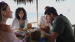 Friends eating and drinking while talk in restaurant on the beach - 4K stock video