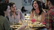 Friends talk and laugh together in restaurant