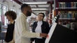 Friends using the self checkout to borrow books from the library - including a transgender person - 4K stock video