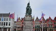 Front view of the Jan Breydel and Pieter de Coninck monument at De Markt square in Bruges, Belgium, Surrounded by Flemish-style gabled houses and flags, Historical sculpture and cultural heritage concept, Brugge - 4K stock video