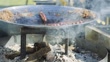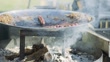 Frying German sausage on the big pan. Some one turns the sausages - 4K stock video