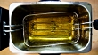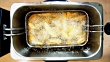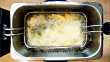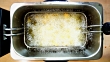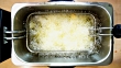 Closeup top view time lapse of french fries or chips being fried in deep fryer and oil. At some moment unrecognizable person pulls out the fries to see if they're done after which they're put back in the oil. Tripod shot. 5 minutes compressed into 18 seconds.